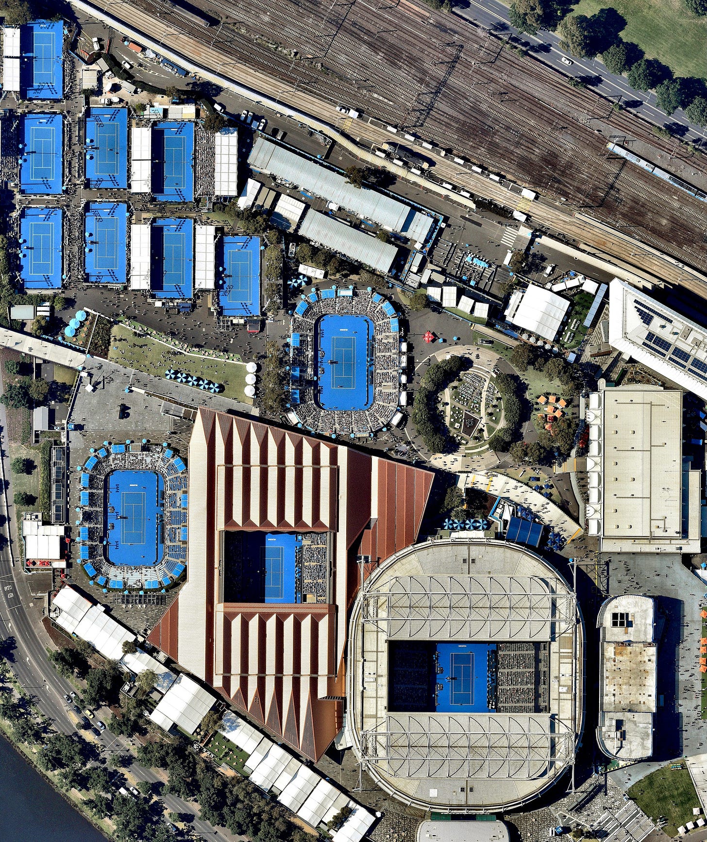The Australian Open tennis tournament is underway in Melbourne, Australia and will run until February 1. The event is held annually at Melbourne Park and is the first of the four Grand Slam tennis events each year, preceding the French Open, Wimbledon, and the US Open. The stadium’s two largest arenas — Rod Laver Arena and Margaret Court Arena — are visible in this Overview.